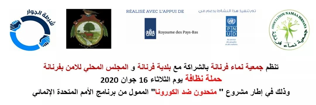 À partir du 16 juin 2020 et pour une durée de 03 jours, l'Association Namaa Franana organise une campagne de nettoyage en partenariat avec les municipalités de Ferrana, Bani Mutair et Al-Jawawdeh, ainsi qu'en partenariat avec le Conseil de sécurité local de Furnana. Cette activité est réalisé dans le cadre du projet «United Against Coronavirus» financé par le programme Le Programme des Nations Unies pour le développement comprend les points suivants: